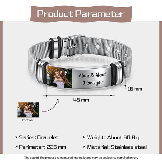 Custom Color Photo Engraved Name Strap Bracelet Adjustable Stainless Steel Pirture Image Personalized Gifts for Men Father (Black/Silver)
