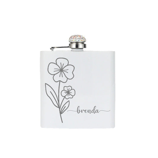 Personalized Flask for Women, Birth Month Flower with Name Flask Gift, 6oz White Flask with Shining Rhinestone Cap, Custom Birthday Gift, Bridesmaid Gift Party Favor